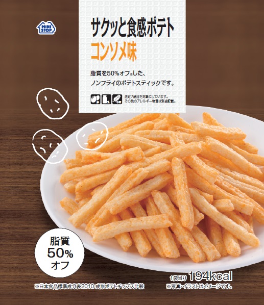 サクッと食感ポテト コンソメ味近年の健康志向の高まりを背景に、菓子類においても健康を感じられる商品が求められています。そこでミニストップでは、“おいしく健康”を訴求したお菓子を発売してまいります。