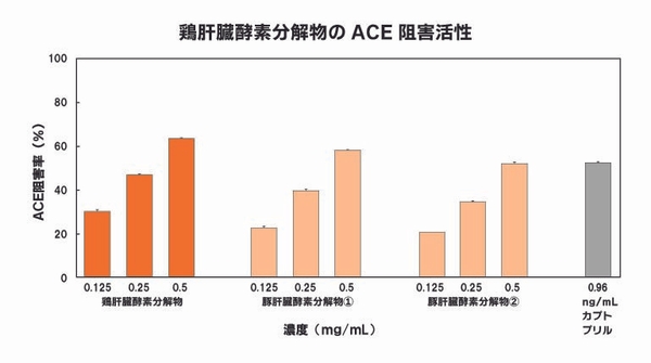 鶏肝臓酵素分解物(鶏レバーエキス)は、旨味や風味を付加する呈味料としてスープや煮込み料理などに利用されています。一方で、豚レバーを用いた豚肝臓水解物は、ACE阻害活性や抗酸化作用等が報告されており、医薬品や機能性食品成分として利用されています。豚肝臓水解物同様に鶏肝臓酵素分解物(鶏レバーエキス)にもACE 阻害活性を有することを見出すことで、更なる有効利用ができることを目的として本研究を行いました。