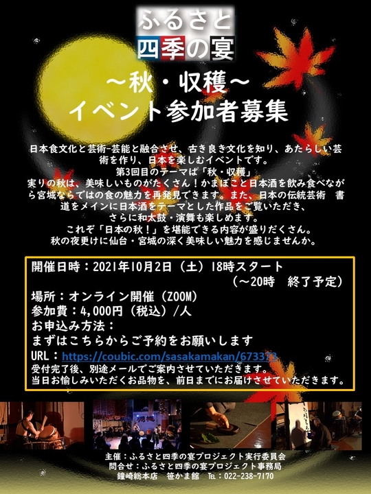 プロジェクト活動の第三弾として、秋・収穫をテーマに笹かま×日本酒のペアリングをメインに演舞演奏もご覧いただけるオンライン型イベントを開催いたします。参加団体は、株式会社鐘崎(笹かまぼこ)、株式会社むとう屋(日本酒)、親かめ子かめ(書道・アーティスト)、Atoa.(和太鼓)及び各分野で活躍するアーティストの皆様です。
