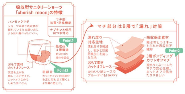「cherish moon」の開発にあたり、ブルーデイに気になることを調べたところ、一番気になるのは「ナプキンからの漏れ」。ブルーデイの悩みを軽くするために、「cherish moon」の吸水ショーツは、4層の吸収体、3層のラミネート加工されたカットオフマチと総レース生地の合計8層で、念には念をいれた構造になっています。しっかりした吸水はもちろん、ナプキンからの伝い漏れ対策もしています。