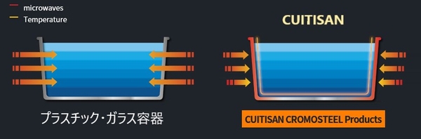 電子レンジで温める場合、まずCuitisanの側面部のステンレス部分が温まることで外側から中の食品へ熱を伝える仕組みになっております。