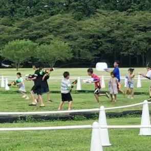 連射や加圧の機能を持つ水鉄砲で、水を当て合うアクティビティ。エリアでは、ミスト散布を行うので、昨年よりも涼しく遊べます。