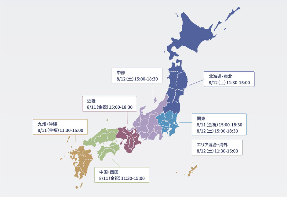 ・関東:8/11(金祝)15:00-18:30、8/12(土)15:00-18:30