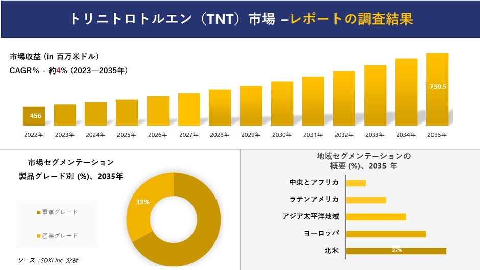 提出日 (2023年08月08日)、SDKI Inc.(本社:渋谷区、東京都)は、2023年と2035年の予測期間を対象とした「トリニトロトルエン(TNT)市場」に関する調査を実施しました。