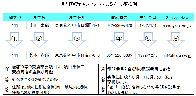 本ソリューションのエンジンとなるアグレックスの「個人情報秘匿システム」は、本番環境の実データをもとに、姓名を全く別の姓名に置き換える、住所を全く別の住所に置き換えるといったように、データ属性や特徴を維持したまま架空のデータを短時間で生成できます。個人情報を完全に排除した本番同等の高品質なテストデータにより、システムテストの精度向上と情報漏えいリスク低減を同時に実現します。