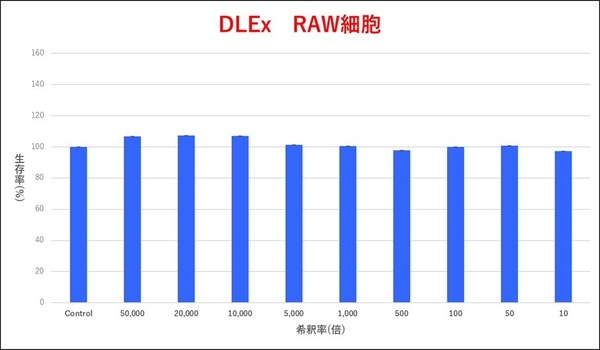 マウス由来マクロファージRAW264.7細胞とヒト由来毛包ケラチノサイトを用いて、ドラゴンリーフ細胞液を添加して24時間後の吸光度を測定。結果、10倍から50,000倍までのどの希釈溶液においても、RAW細胞、毛包ケラチノサイトいずれに対しても細胞毒性を有しないことを検証いたしました。