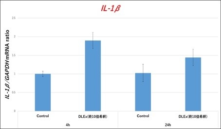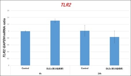 その結果、RAW細胞においてはTLR2(Toll-like receptor II)、IL-1β(Interleukin I beta)、IL-6(Interleukin VI)が有意に誘導され、iNOS(Inducible nitric oxide synthase (nitric oxdie synthase 2))が抑制されました。これによりドラゴンリーフ細胞液はTLR2といった受容体を介して免疫調節作用を有することが推測されます。