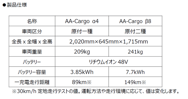 aidea社が販売する商用3輪電動バイク「AA-Cargo α4/β8」は、既存バイクメーカー以外では初となる型式認定を取得し、国※1および東京都※2からエコカーや電動バイク普及促進の補助金対象車両として指定されるとともに、国内の宅配便業界や大手外食チェーンなどに導入されています。また、2023年に発売予定の2輪の電動バイク「AA-wizシリーズ」は、他社比約1.5倍容量のバッテリーを搭載することで、全⻑や重量は同等でありながら、一充電走行距離が他社製品に比べて長い走行性能を目指しています。