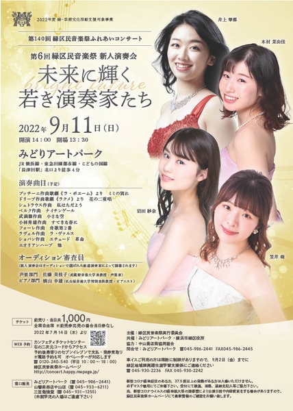 緑区民音楽祭実行委員会主催、第140回緑区民音楽祭ふれあいコンサート『未来に輝く若き演奏家たち』が2022年9月11日 (日)に横浜市緑区民文化センター みどりアートパークホール(神奈川県横浜市緑区長津田二丁目1番3号)にて開催されます。