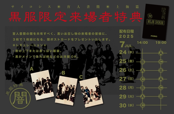 なお、来場者特典として黒服で来場の際にはキャストのヴィジュアルが並んだランダムポストカードが配布される予定。劇場を黒く染めて更なる闇を共有しよう。