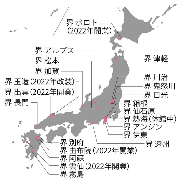 「界」は星野リゾートが全国に展開する温泉旅館ブランドです。「王道なのに、あたらしい。」をテーマに、季節の移ろいや和の趣、伝統を生かしながら現代のニーズに合わせたおもてなしを追求しています。また、その地域の伝統文化や工芸を体験する「ご当地楽」や、地域の文化に触れる客室「ご当地部屋」が特徴です。現在、全国各地に展開しており、2022年1月に19施設目となる「界 ポロト」が北海道・白老温泉に開業しました。