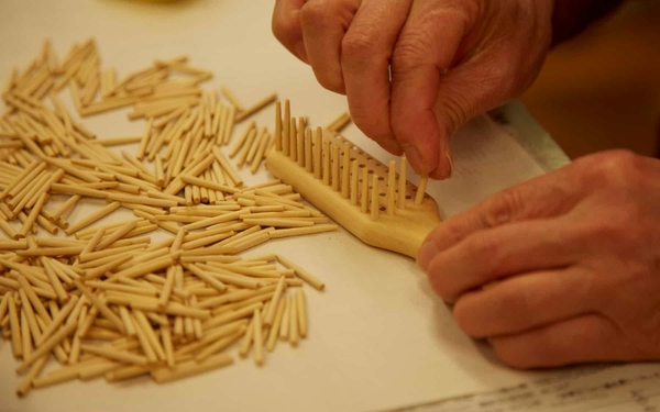工房では、材料となる薩摩柘植(つげ)の素材を見て、それがどのような作業を経てブラシに仕立てられるかを見学します。ブラシの本体も、ピンも、髪を通したときに引っ掛かりが無く滑らかになるように、職人の手の感覚一つひとつ確認しながら、丁寧に削られます。その後、土台にピンを1本ずつ差し込み、固定する組み立ての様子、櫛通りを良くするためにブラシ全体を椿オイルに浸して乾かすまでの一連の作業を職人の説明を受けながら見ることができる体験です。