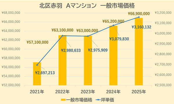 Aマンションの一般市場価格・坪単価の推移は上記【図3)の通りです。