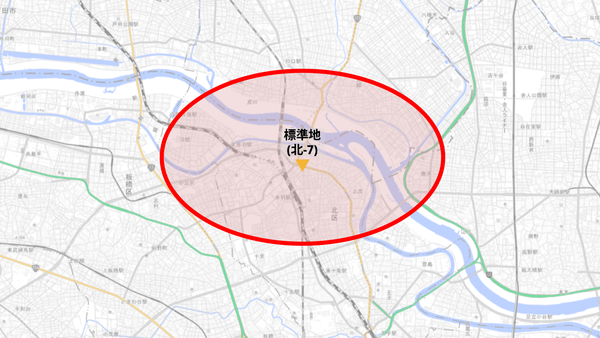 今回は、標準地(北-7)周辺の下記エリア内のマンション事例①(築10年~19年)、マンション事例②(築20年~29年)、マンション事例③(築30年~45年)を対象に、過去5年の一般市場価格を抽出します。