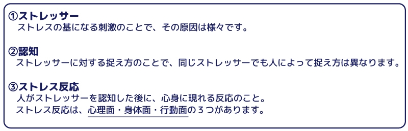 そもそも「ストレス」とは、外部環境からの刺激(ストレッサー)により、心身に有害な反応(ストレス反応)が起こる過程をストレスと呼びます。