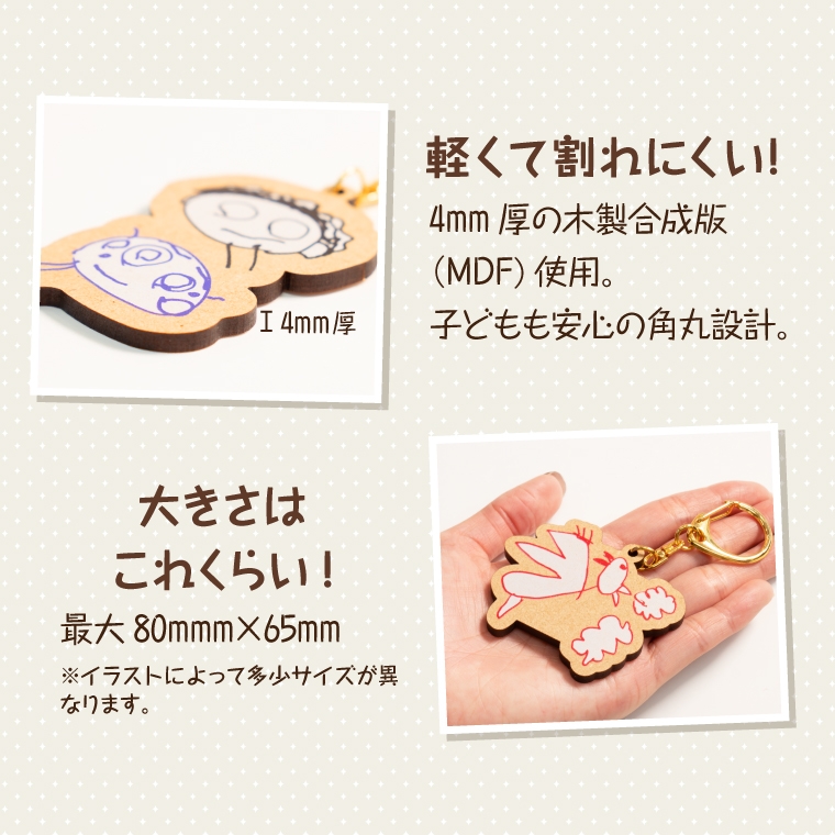 温かみを感じるような木製素材を使用しているので、個性のあるお子さまのイラストもナチュラルテイストで普段使いしやすいオシャレなキーホルダーに仕上がります。