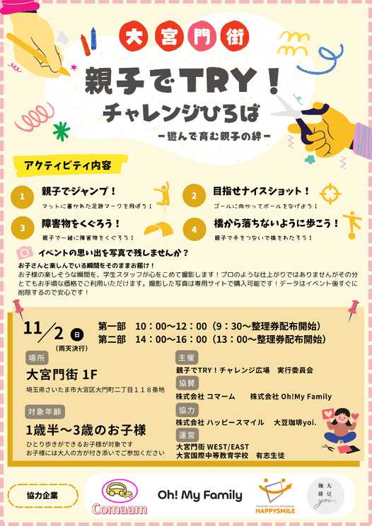 大宮門街 × 大宮国際中等教育学校有志生徒 × 株式会社ハッピースマイル 「親子でTRY!チャレンジひろば」11月2日(日)開催