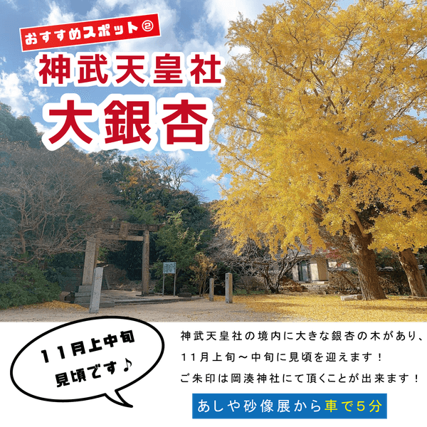 開花は、11月上旬から下旬。神武天皇社のご朱印については、岡湊神社(車で5分)でいただくことができます。
