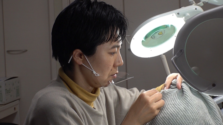 多いときで1日10件ものニット製品を一人で修繕する「ニットキュア」代表の植木睦子さん。左肩付近に虫喰いと思われる4つの穴が空いたニットの修繕作業に密着すると・・・なんと、穴を塞ぐどころか、糸をほどいて逆に穴を広げていきました。