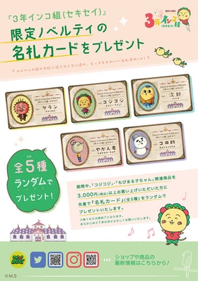 期間中、「コジコジポップアップショップ 3年インコ組(セキセイ)」で「コジコジ」商品を3,000円(税込)以上お買い上げいただいたお客様に名札カードを、全5種類からランダムで1枚プレゼントいたします。