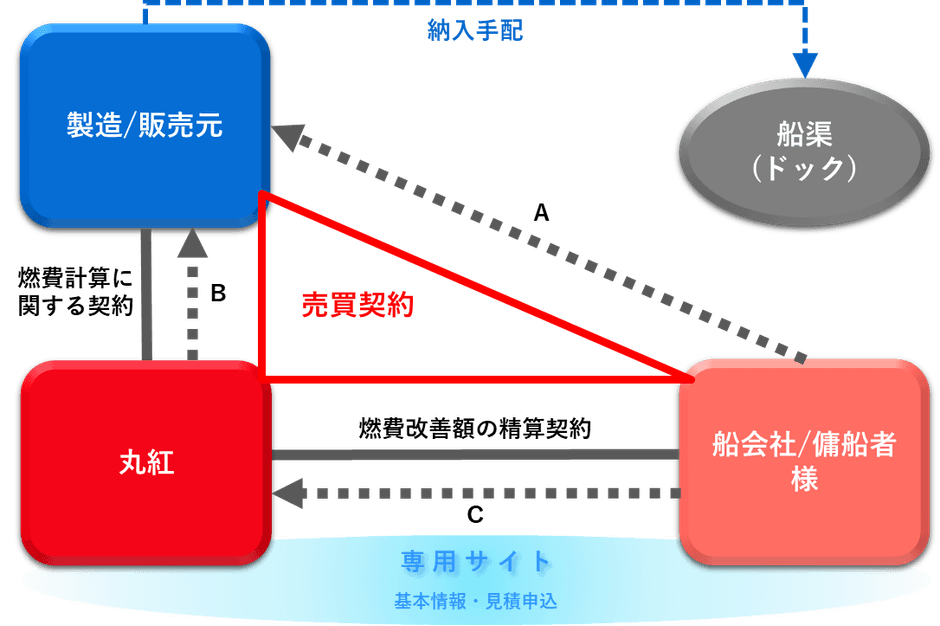 実際に燃費低減効果があった場合、燃費削減額の一部 (=C) を成果払い方式で四半期毎に丸紅に支払う形になります。