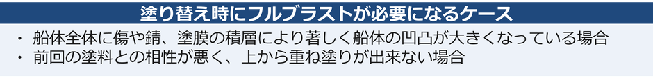 ※ 塗料同士の相性、前回ドック時の工程、船齢など船毎のデータに応じてブラスト処理の度合いは異なります。