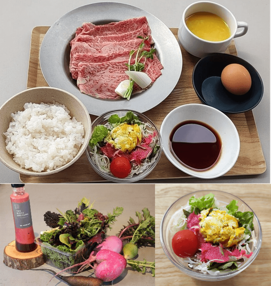 栃木県大田原市のピンクサラダさんが育てた『化学肥料・農薬不使用』のビーツで作った“自家栽培ビーツドレッシング”を「栃木県産黒毛和牛焼きすきセット」に添えられたハロウィーン期間限定かぼちゃサラダにかけてお召し上がりいただけます。