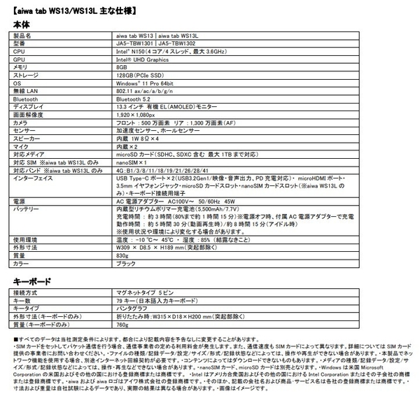 aiwa tab WS13:94,800円(税込)/aiwa tab WS13L:99,800円(税込)