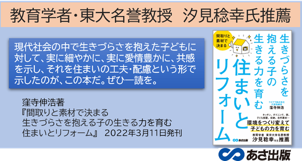 株式会社あさ出版(代表取締役:佐藤和夫、所在地:東京都豊島区)は窪寺伸浩著『間取りと素材で決まる 生きづらさを抱える子の生きる力を育む住まいとリフォーム』http://www.asa21.com/book/b599183.html を2022年3月11日(金)に刊行いたします。