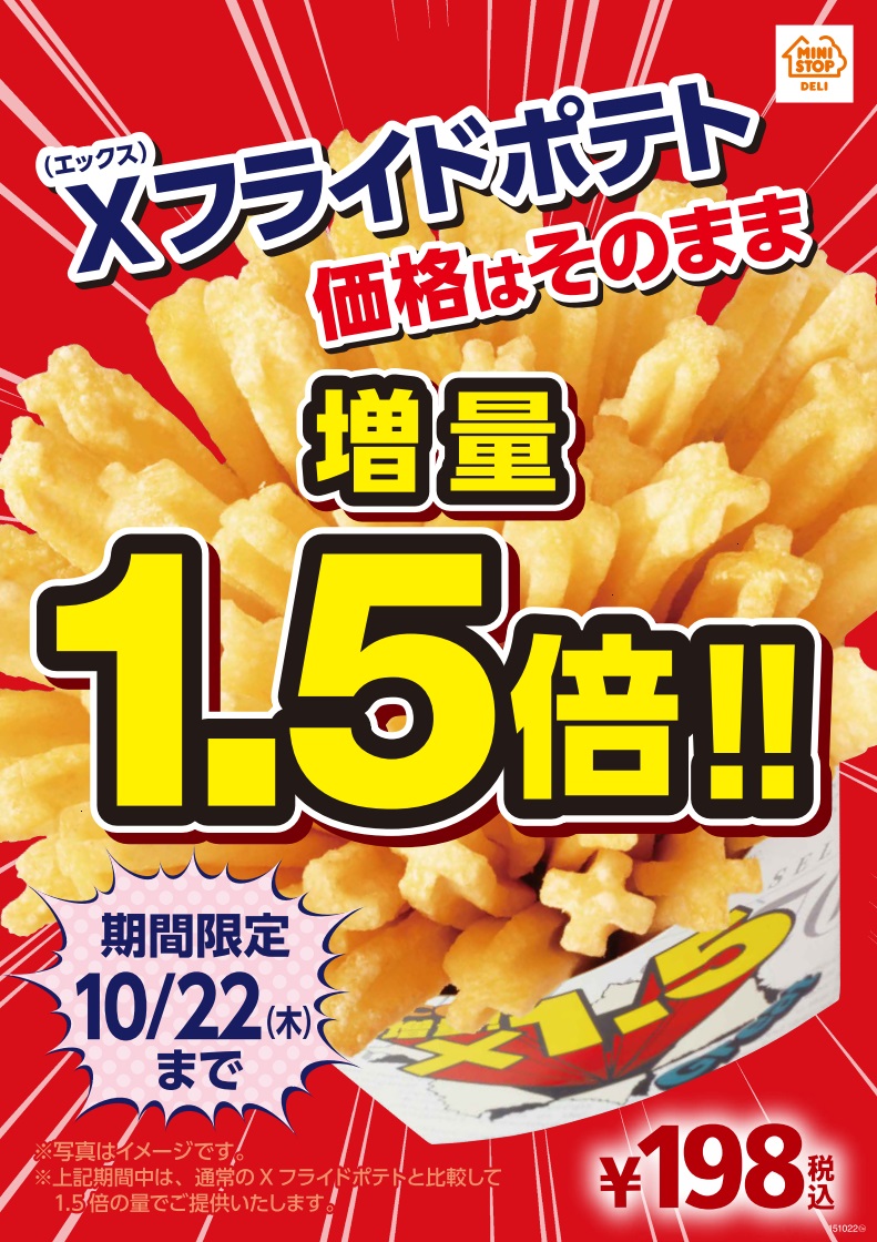2015年10月14日 15:00 ミニストップ株式会社(本部:千葉県千葉市 代表取締役社長:宮下 直行、以下ミニストップ)では、2015年10月16日(金)から10月22日(木)までの一週間、国内のミニストップ店舗(2015年9月末現在:2,172店)にて、「X(エックス)フライドポテト1.5倍増量セール」を実施いたします。