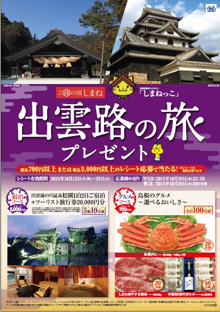ミニストップ株式会社(本部:千葉県千葉市 代表取締役社長:宮下 直行、以下:ミニストップ)は、2015年10月12日(月・祝)より、島根の魅力を景品にしたプレゼントキャンペーンを、国内のミニストップ(2015年8月末現在:2,179店)において実施いたします。 島根県は、出雲大社の平成の大遷宮や松江城の国宝指定などにより、知名度が上昇している今話題の地域です。そこでミニストップでは、島根県の魅力を景品にしたキャンペーンを実施します。 SNS上では、島根県の観光キャラクター「しまねっこ」も一緒にキャンペーンを盛り上げます。