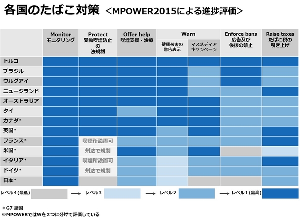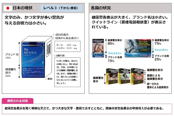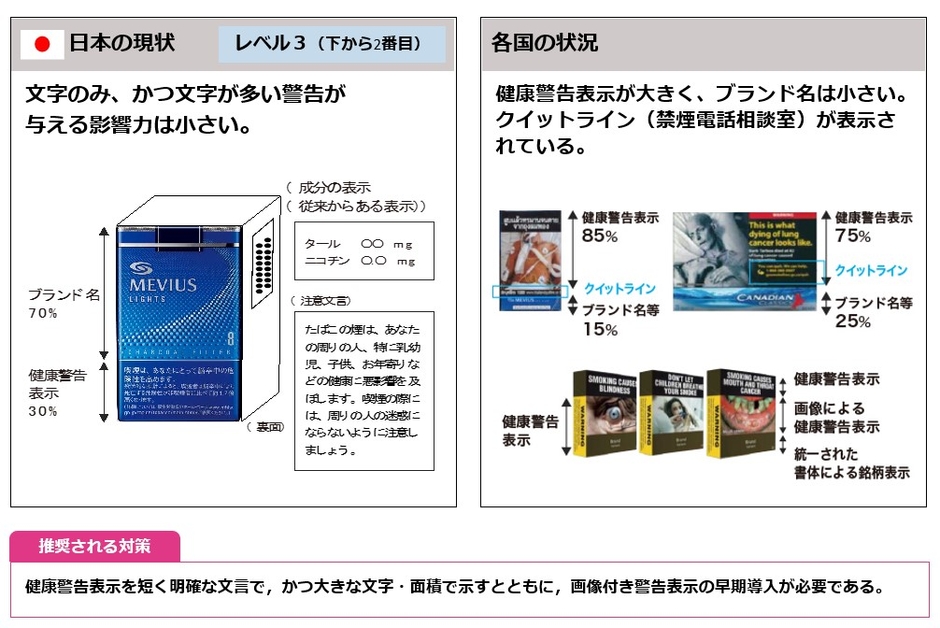 日本は、いろいろな禁煙対策において世界と比較した場合どうなのでしょうか?少し古いデータですが、2016年の厚生労働省資料によると、