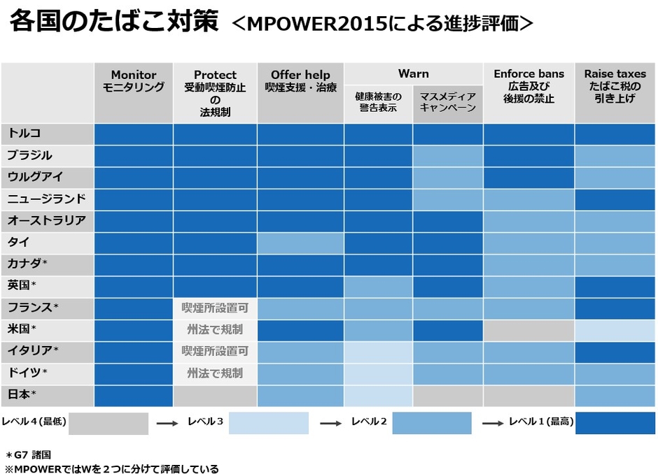 南米の国々も最高レベルのたばこの煙のない環境である中で、日本はその他のレベルの国と地域になっているので、喫煙場所に関して世界で比べるとまだまだ甘い国だといえると思います。