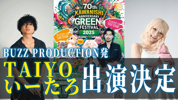 「Z世代の可能性を信じ、引き出し、拡張する」といったビジョンのもと、エンターテインメントを軸に、Z世代の早期人材育成事業を展開する株式会社LIFEEntertainment( 本社:東京都渋谷区、代表取締役社長:大越春輝)が運営する、BUZZPRODUCTION〈バズプロダクション〉所属アーティスト『TAIYO S/B from a-CREW』が、2025年8月10日(日)に開催される川西町制70周年記念事業の川西夏まつり「KAWANISHI GREEN FESTIVAL 2025」にて出演が決定いたしました。