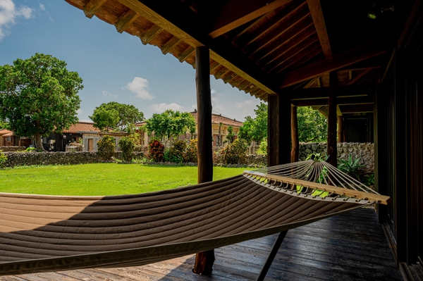 施設から送迎車で約5分の場所にあるヴィラには、フリードリンクやWi-Fi、各席から繋げるコンセントなど、仕事に便利な設備や備品を用意しています。フリースペースをはじめ、ミーティングやオンライン会議用の貸し切りスペースがあり、用途に合わせて場所を選び仕事ができます。今回は新たに、長さ2.1mのゆったりと使用できるハンモックをテラスに設置しました。ヴィラの軒が作る日陰で、南風を浴びながら快適に過ごせます。好きなタイミングで手軽に休息をとることで仕事の効率を高められます。宿泊施設内とは異なり、仕事をしたい人だけが利用する場所であるため、同行者と離れたり、客室と場所を分けたりすることで仕事に集中できる環境です。