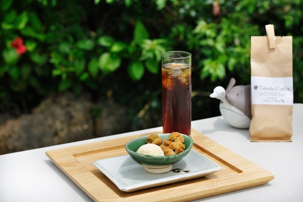 毎日15~16時に、テラス席でコーヒーとお菓子を提供する「青空ブレイクタイム」を実施します。八重山諸島は日本で唯一コーヒーベルトに含まれる場所です。「青空ブレイクタイム」では、石垣島に農園をもつ「Takeda Coffee」が星のや竹富島専用にブレンドしたアイスコーヒーを提供します。お菓子は、冷たいアイスを添えた、揚げたての「さたくんこう」*2です。沖縄の気候に合うすっきりとした味わいのコーヒーを片手に、一息つくことができます。