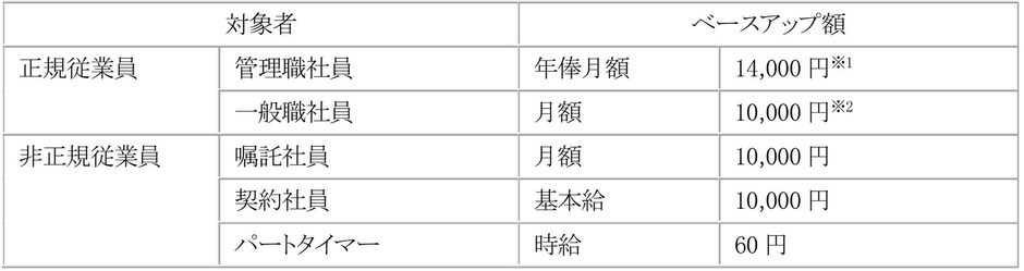 ※1 管理職社員のベースアップ額は一般職社員の賞与支給月数分(平均5ヶ月)を加味した額のため、年換算での管理職社員と一般職社員のベースアップ額は同水準。