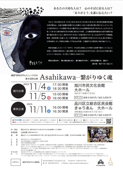 劇団「BREATH」/放送作家集団DNP主催、ミュージカル 第8回本公演『asahikawa...繋がりゆく魂』が2023年11月11日 (土)に品川区立総合区民会館 きゅりあん 大ホール(東京都東京都品川区東大井5-18-1)にて上演されます。