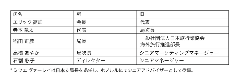 ハワイ州観光局 日本支局(所在地:東京都千代田区 局長:ミツエ・ヴァーレイ)は、2025年10月1日(水)より新組織体制で活動を開始します。これまで局長を務めていたミツエ・ヴァーレイは退任し、ホノルルにてシニアアドバイザーとして従事。そして、局長には、一般社団法人日本旅行業協会(JATA)にて、日本のアウトバンドを促進してきた稲田正彦が新たに就任します。