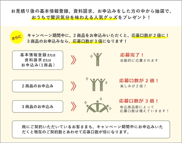 本キャンペーンでは、申込商品数に応じて応募⼝数が変動し、2商品をお申込みの場合は応募⼝数が⾃動的に2倍、3商品をお申込みの場合は応募⼝数が⾃動的に3倍になります
