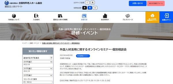 今後、介護人材不足はさらに深刻となることが懸念されていることから、公益社団法人全国有料老人ホーム協会(理事長:中澤俊勝、所在地:東京都中央区)では、 2023年度の外国人材活用支援として、定期的に「オンラインセミナー&個別相談会」を実施します。もちろんスポットでのご参加も大歓迎です。