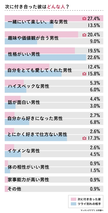 一方で、ツライ別れの相手として多かった「とにかく好きで仕方ない男性」「自分をとても愛してくれた男性」の割合は減っています。