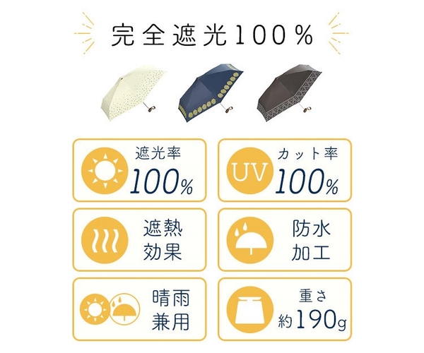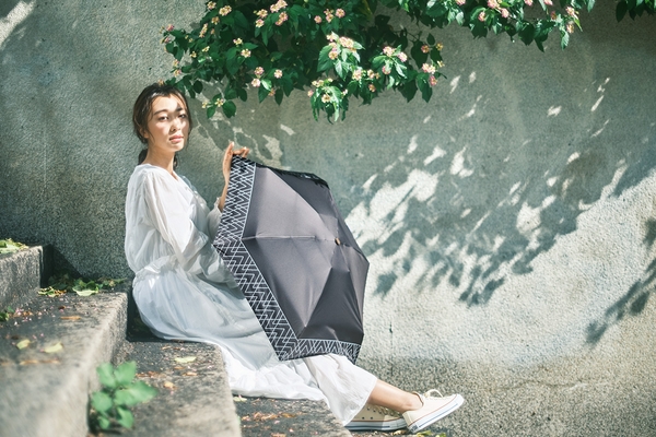 「ノルディックパラソル」は生活に溶け込む優しい北欧柄。約190gというコンパクトなサイズ感で、雑貨感覚で持ち運べるミニマムさが特徴です。完全遮光100%・遮熱効果・防水加工という高いスペックも兼ね備えているので、真夏の暑い日差しの中だけでなく、急な雨にも対応できる万能な日傘であなたを紫外線から守ります。