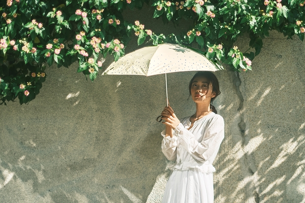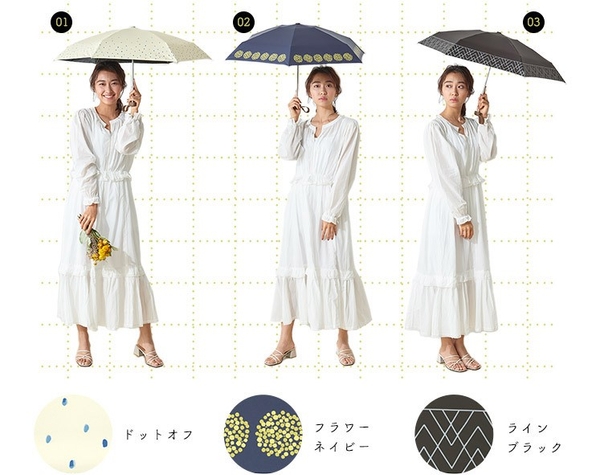 傘に降り注ぐ雨粒のような手書き風ドット。服装を選ばない使い勝手の良さも魅力。