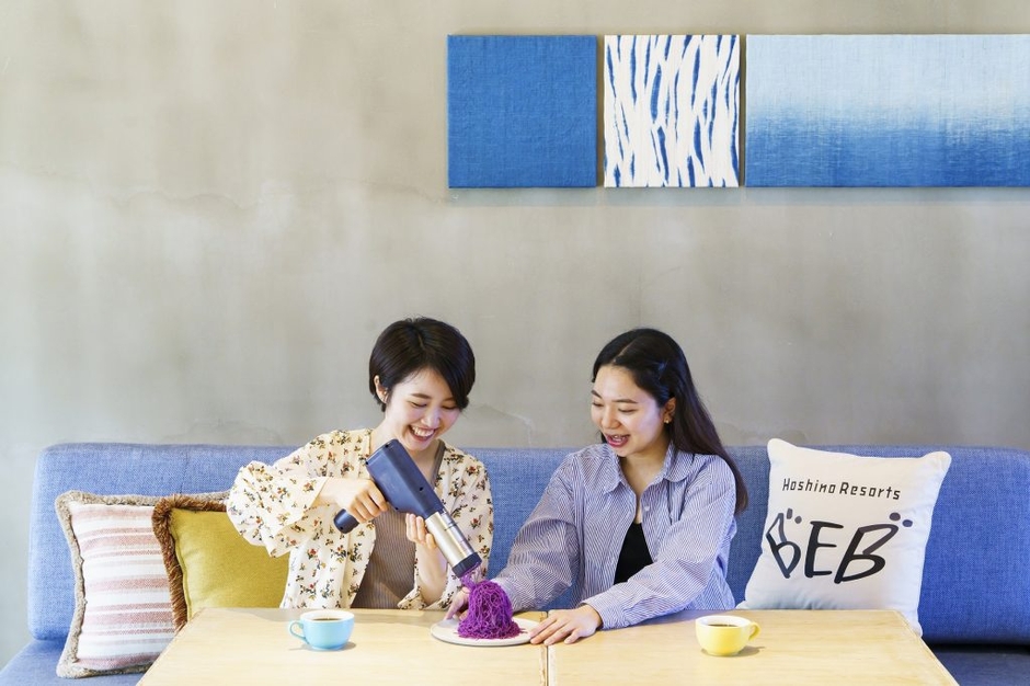 カフェでは、BEBブランドで大人気の「#盛れるモンブラン」をBEB5沖縄瀬良垣限定で「紅芋モンブラン」として販売します!紫色の色鮮やかな紅芋のペーストは自分で絞ることができ、高く盛れる、自分で盛れるスイーツを作ることができます。モンブランを絞っているときの写真や動画でも楽しむことができる体験型スイーツです。