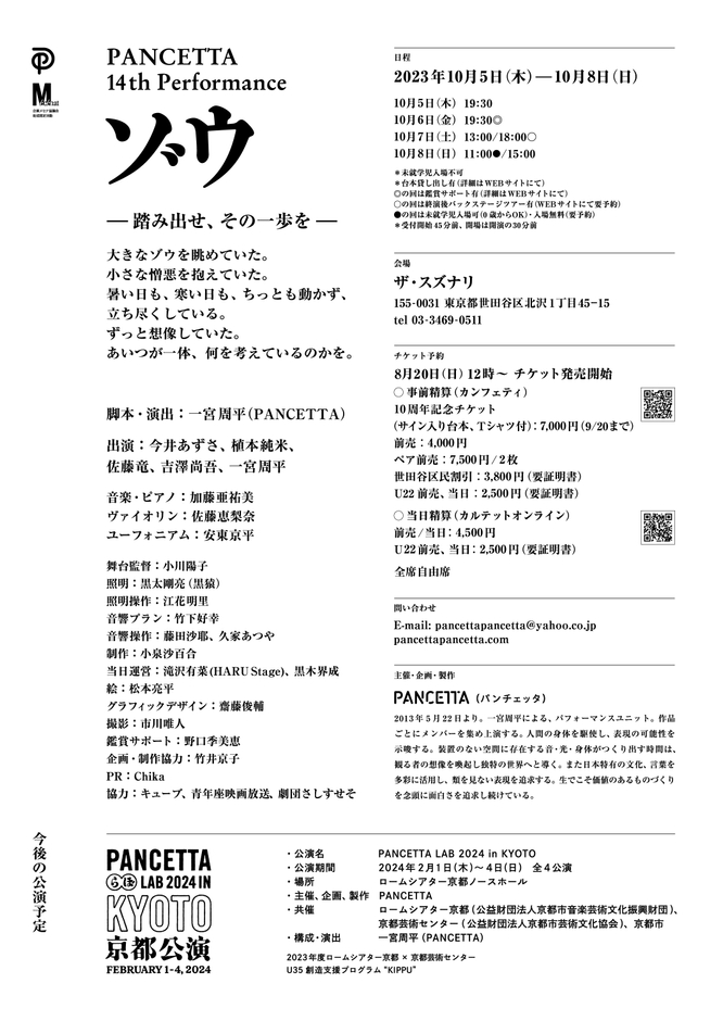 『PANCETTA 14th performance “ゾウ”』が2023年10月5日 (木) ~2023年10月8日 (日)に下北沢 ザ・スズナリ(東京都世田谷区北沢1-45-15 )にて上演されます。