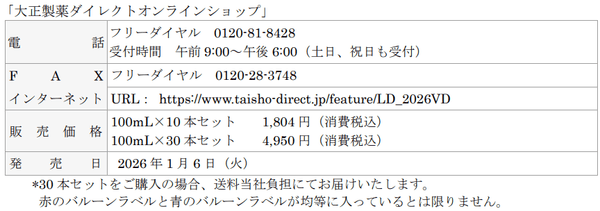 大正製薬株式会社[本社:東京都豊島区 社長:上原 茂](以下、当社)は、2026年のバレンタインデーをさらに盛り上げる特別なアイテム「リポビタンD バレンタイン限定ボトル2026」を2026年1月6日(火)から、数量限定、通販限定で当社通販サイト「大正製薬ダイレクト」等にて販売開始いたしました。