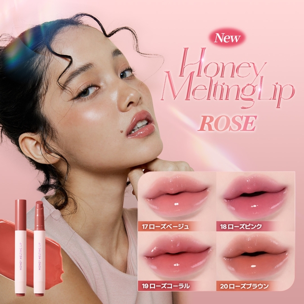 「ハニーメルティングリップ」は唇に蜂蜜を塗ったような光沢を感じられるリップスティックで、8種類の天然由来オイルとマヌカハニー(ハチミツ)エキス、バラエキスを配合。唇にナチュラルなツヤ感を与えて、乾燥しがちな唇をしっかり保湿しケアしてくれます。また、唇の温度に反応する「ソフトメルティングフォーミュラ」技術を採用し、ひと塗りで唇の上でとろけて密着しぷっくりボリューム感のある唇を演出します。リップグロスを塗ったようにベタつかずに唇の潤いが長持ちすることが特徴です。
