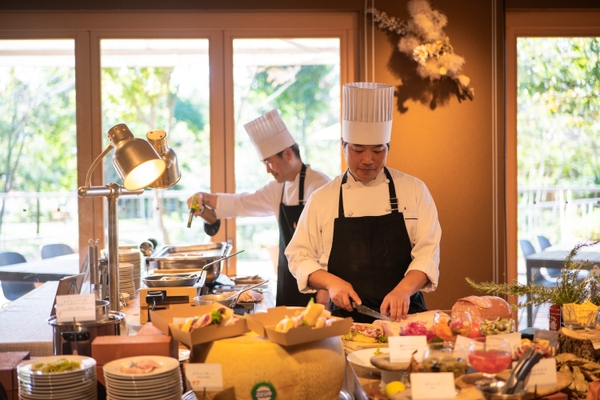 冬のウェルビーイング朝食では、シェフが目の前で調理を行うライブキッチンも引き続きご用意。モルタデッラやジャンボンブランなどの上質なハムとソーセージを使用し、目の前でカットして、国産小麦のベーグルや桐生酵母ロールにサンドイッチとして仕上げます。お客様は専用容器に詰めて、テラスやガーデンで自然を感じながらお召し上がりいただけます。
