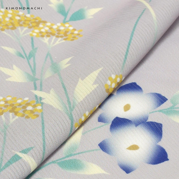 明るいグレーの地に女郎花(おみなえし)などの秋草文様。青磁色にごく淡い黄緑の葉。からし色、黄土色に白などの細かな女郎花の花、青紫ぼかしの桔梗、わずかにグレーのススキの穂など、輪郭線がなくぼかした色彩の表現が優しい印象です。